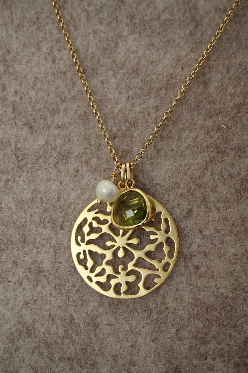 Il medaglione di questa collana è traforato con un bel motivo di fiori delicati e stilizzati e per dare luce alla collana una goccia incastonata e una piccola perla.