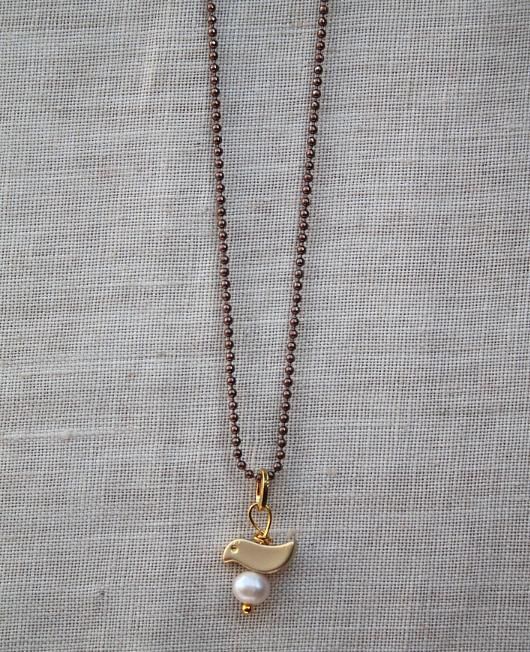 Deliziosa collana con fine catena di colore bronzo; un piccolo uccellino poggiato su una perla conferisce maggiore preziosità e delicatezza alla collana. E' perfetta indossata sia da sola che con altre collane sottili. Disponibile in 4 lunghezze: puoi scegliere la lunghezza preferita dal menu a tendina.