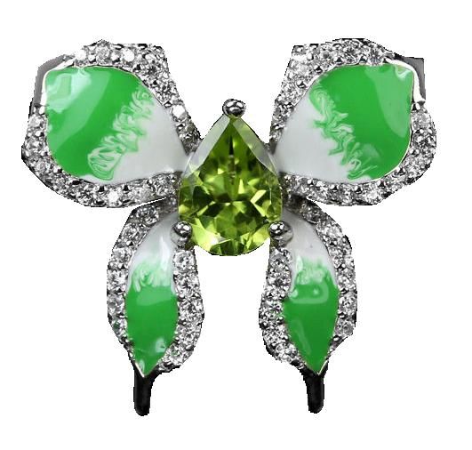 Questo anello è il trionfo della fantasia e della gioia. La farfalla ha le ali smaltate di un verde vivace e allegro, sfumato di bianco e la pietra al centro è un peridoto taglio a pera.