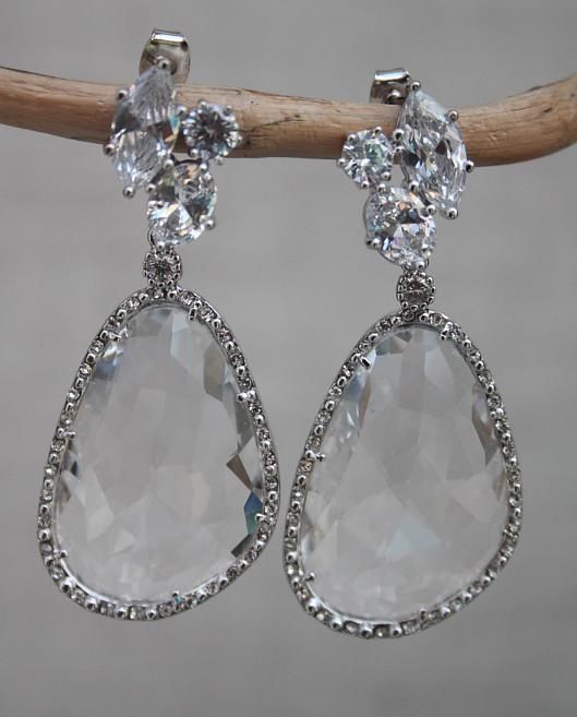 Questi eleganti orecchini dal gusto sofisticato sono caratterizzati da un perno con 3 swarovski da cui pende una grande goccia chiara sfaccettata con un castone di piccoli zirconi per dare più luce.