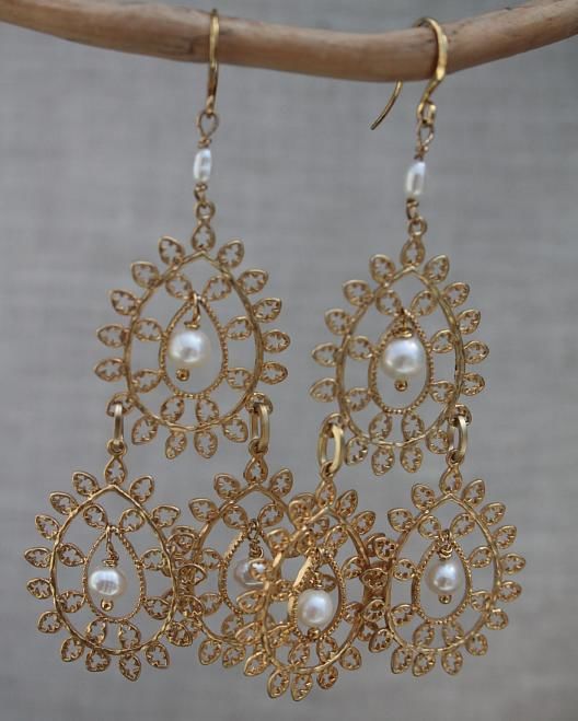 In stile bohemian chic questi orecchini sono ispirati alla Sicilia: il motivo pizzo si ripete con 3 moduli tutti mobili per conferire movimento a tutto l'orecchino impreziosito da piccole perle in più punti.