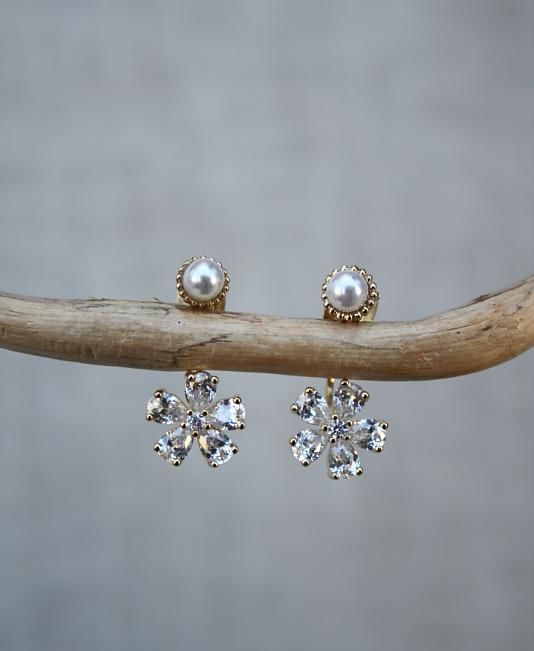 Il modello di orecchini "Fiori" ha il perno con una perla con castone a corona ed un bellissimo fiore di zirconi. La particolarità di questi orecchini è che il motivo a fiore appare da sotto il lobo creando così un effetto di perfetta armonia con l'orecchio.