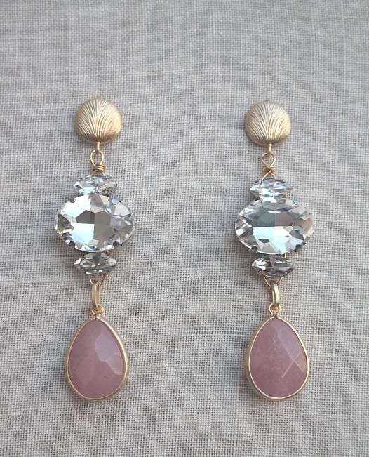 superfemminili e luminosi gli orecchini mod. Decò con centrale di cristalli sfaccettati e una goccia pendente di calcedonio rosa