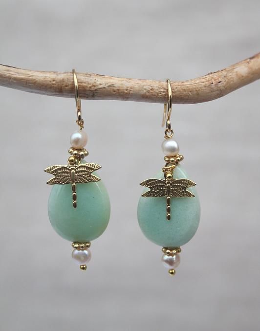 Armoniosi ed eleganti, questi orecchini hanno una goccia di amazonite in una tonalità verde chiaro, dei terminali in perle e una graziosa piccola libellula. Realizzati interamente a mano. Li potrete indossare tutti i giorni. Femminili e delicati, perfetti per le amanti della natura e le romantiche.