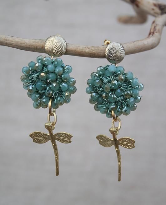 La forma di questi orecchini ricorda un fiore. Ve li proponiamo in varie combinazioni di colore: qui la parte superiore è verdino Tiffany, l'elemento pendente è una splendida libellula.