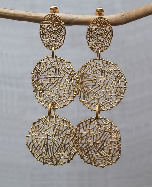 Il perno e i due cerchi mobili pendenti di questi orecchini lunghi di design sono realizzati con una tecnica di sovrapposizione di fili di metallo che crea una trama delicata e astratta di grande effetto.