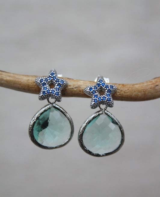 Da un perno a forma di stella marina di meravigliosa fattura, pende una goccia color acquamarina. Le stelle marine hanno piccoli zirconi di colore blu cobalto per dare maggiore lucentezza.