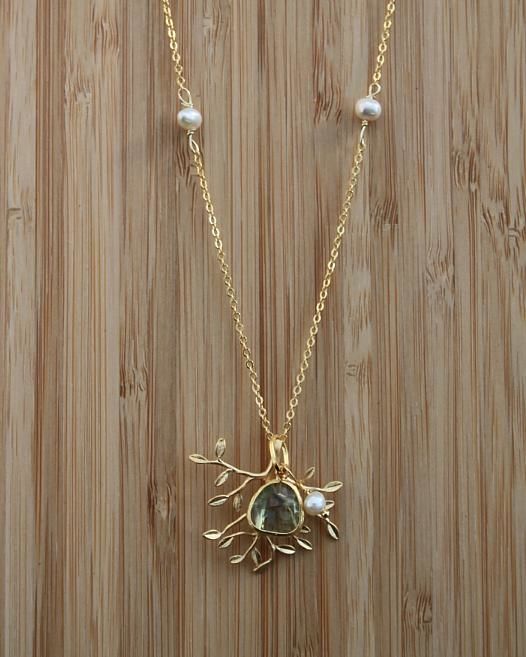 E' un delicato intreccio di rami con delle piccole foglioline il ciondolo a forma di albero per questa collana semplice e raffinata. Una piccola goccia per dare un tocco di luce. Le perle sulla catena e sul ciondolo conferiscono maggiore preziosità e delicatezza alla collana.