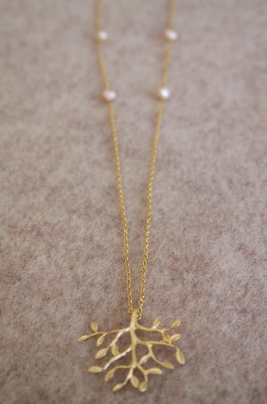 E' un delicato intreccio di rami il ciondolo per questa collana semplice e raffinata. Lungo la catena sono intervallate 4 piccole perle naturali. La collana è lunga 60 cm.