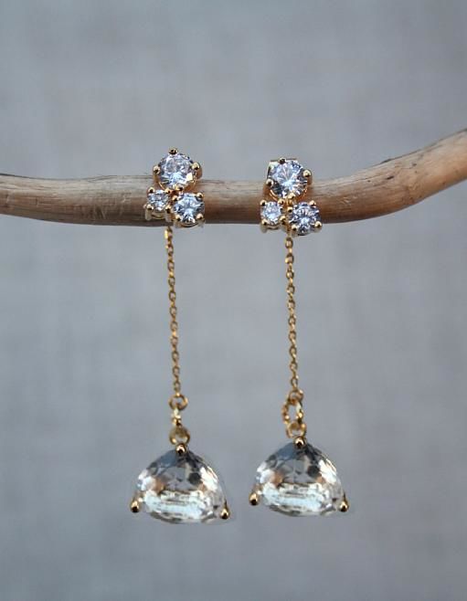 Il modello di orecchini "Love" ha il perno con 3 swarovski e una sottile catena da cui pendono due belle gocce chiare sfaccettate dalla forma leggermente triangolare. La particolarità di questi orecchini è che la catena e la goccia pendono dal retro del lobo e così creano un effetto sfalsato e danno più movimento all'orecchino.